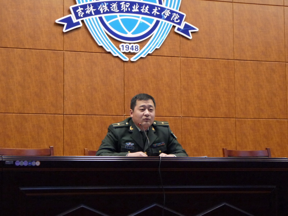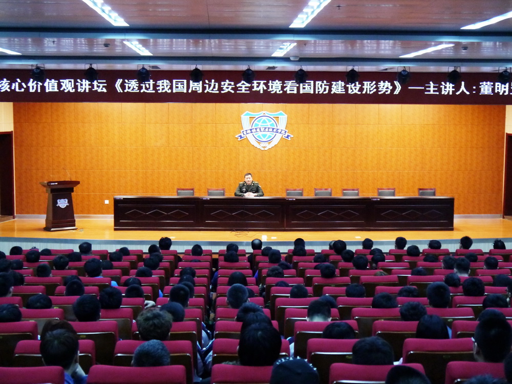 3 月 16 日 14:00,我院在图书馆报告厅举办了核心价值观国防教育讲座,学院邀请永吉县人武部政工科科长董明罡少校做了题为“透过我国周边安全环境看国防建设形式”的专题讲座。吉林市军分区政治部徐大鹏和董博干事及永吉县人武部常兴国干事、我院党委副书记曹炳志、学生工作部部长刘树全、副部长韩兵兵和各系辅导员及学生近500余人聆听了讲座。