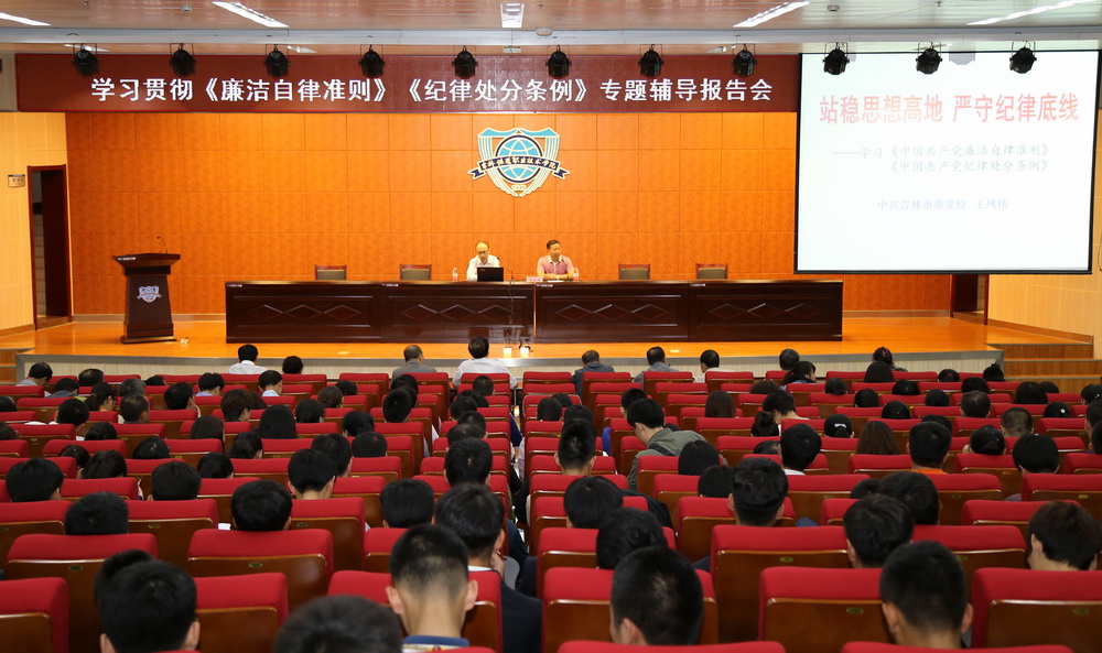 6 月2日 下午,学院纪委在图书馆报告厅举行了《中国共产党廉洁自律准则》和《中国共产党纪律处分条例》专题辅导报告会。学院领导班子成员、教职工党员及发展对象、非党副科级以上干部,学生党员及发展对象、入党积极分子代表等共400多人参加了学习报告会。邀请中共吉林市委党校党史党建教研部副主任王凤伟副教授作了题为《站稳思想高地,严守纪律底线》的专题辅导报告。纪委书记徐彤宝同志主持了报告会。