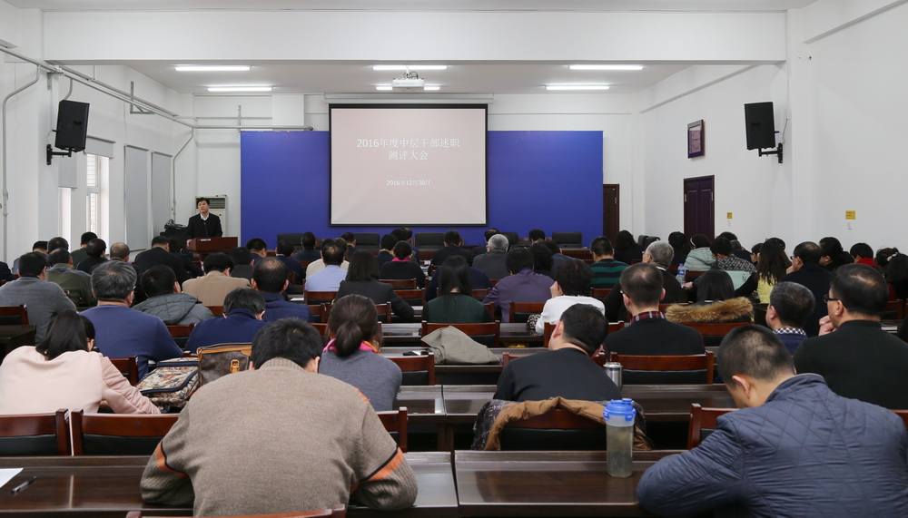 ,学院召开2016年度中层干部述职测评大会,学院党委领导班子成员、中层及以上干部和部分教职工代表参加会议。会议由田雷副院长主持。