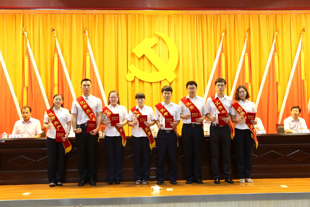受表彰的优秀共产党员标兵上台领取奖杯和证书