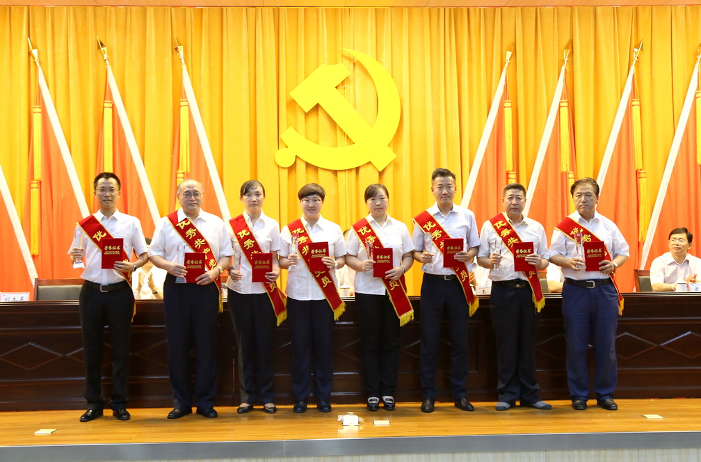 受表彰的优秀党务工作者上台领取奖杯和证书