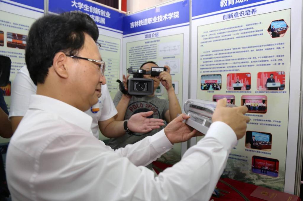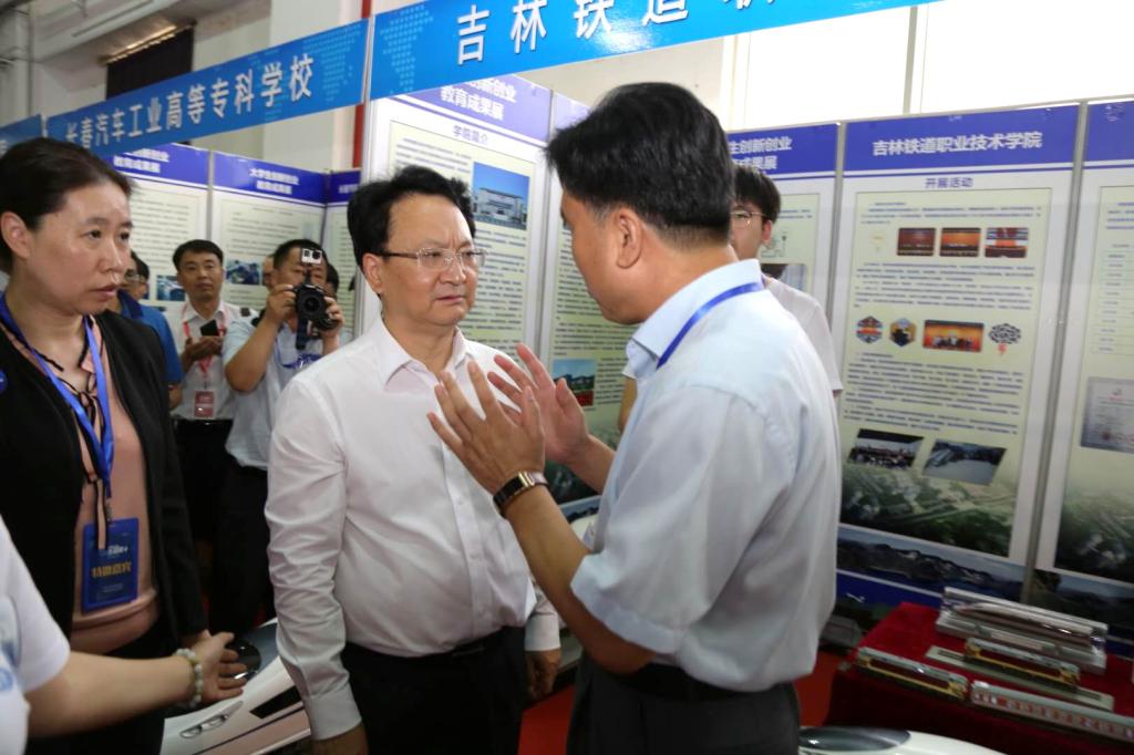27日下午,吉林省委副书记、省长景俊海在吉林省教育厅党组书记、厅长,省高校工委书记李晓杰的陪同下来到展览现场,参观了吉林大学、东北师范大学、长春理工大学、延边大学、吉林铁道职业技术学院等高校学生创新创业展览,深切感受青年学子高涨的“双创”热情。在我院展位前,景俊海省长听取了学院党委书记王喜库、院长曹炳志的介绍和许哲宁同学的讲解,对我院大学生创新创业成果给予了高度评价。