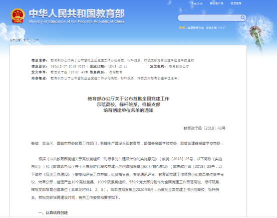 近日,教育部办公厅关于发布《关于公布首批全国党建工作示范高校、标杆院系、样板支部培育创建单位名单的通知》(教思政厅函〔2018〕43号)中,学院铁道信号分院教工党支部入选全国党建工作样板支部,成为吉林省唯一入选的高职院校。