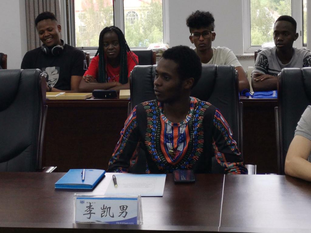 来自肯尼亚的18级轨道交通信号与控制专业留学生代表李凯男发言,他代表所有的留学生,衷心感谢学校领导和老师对留学生们的关爱、支持和帮助。他表示,所有留学生都非常珍惜来吉铁院学习的机会,他将和所有的留学生一起,谨记校长提出来的三点要求,遵守学校的管理规定,努力成为一个好学生、好专家。