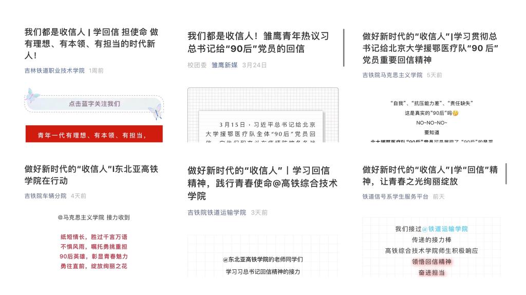 一封来信,赤子心肠;一封回信,饱含深情。师生们在认真学习了习总书记的回信后备受鼓舞,纷纷抒发爱国之情、报国之志,希望用实际行动践行新时代青年的责任与担当,彰显青春力量。学校官方微信平台发布了《我们都是收信人|学回信 担使命 做有理想、有本领、有担当的时代新人》推文,展示学习心得。校团委、各学院先后组织开展了各类学习活动,采取“说”、“唱”、“写”、“拍”、“画”形式,用大白话讲道理,用好作品营造好氛围,充分发挥学工干部、班主任等带头示范作用,通过云会议、线上主题党日等多种形式,分享学习心得,并依托本单位、部门的官方微博、微信等新媒体平台,全景展示师生学习交流情况,进行了一场校内学习“@大接龙”网络互动活动,累积发布微信推文11篇,形成了全校师生“同学习、齐分享、共实践”的生动局面。