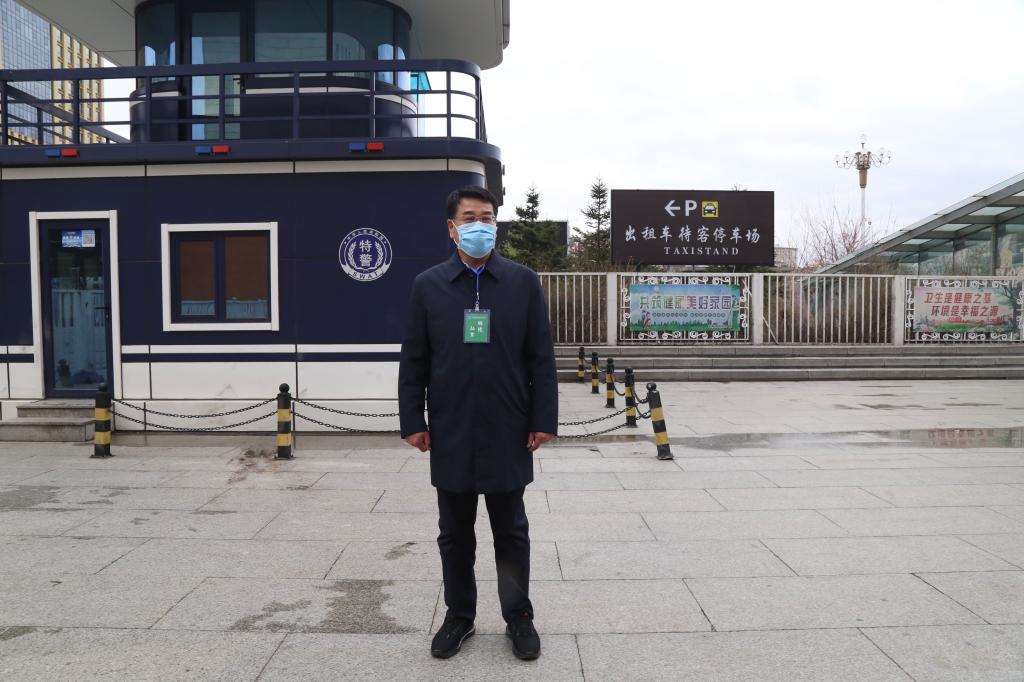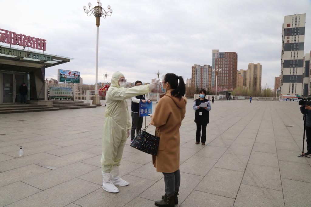 | 测温工作人员在火车站对返校“学生”测温 |