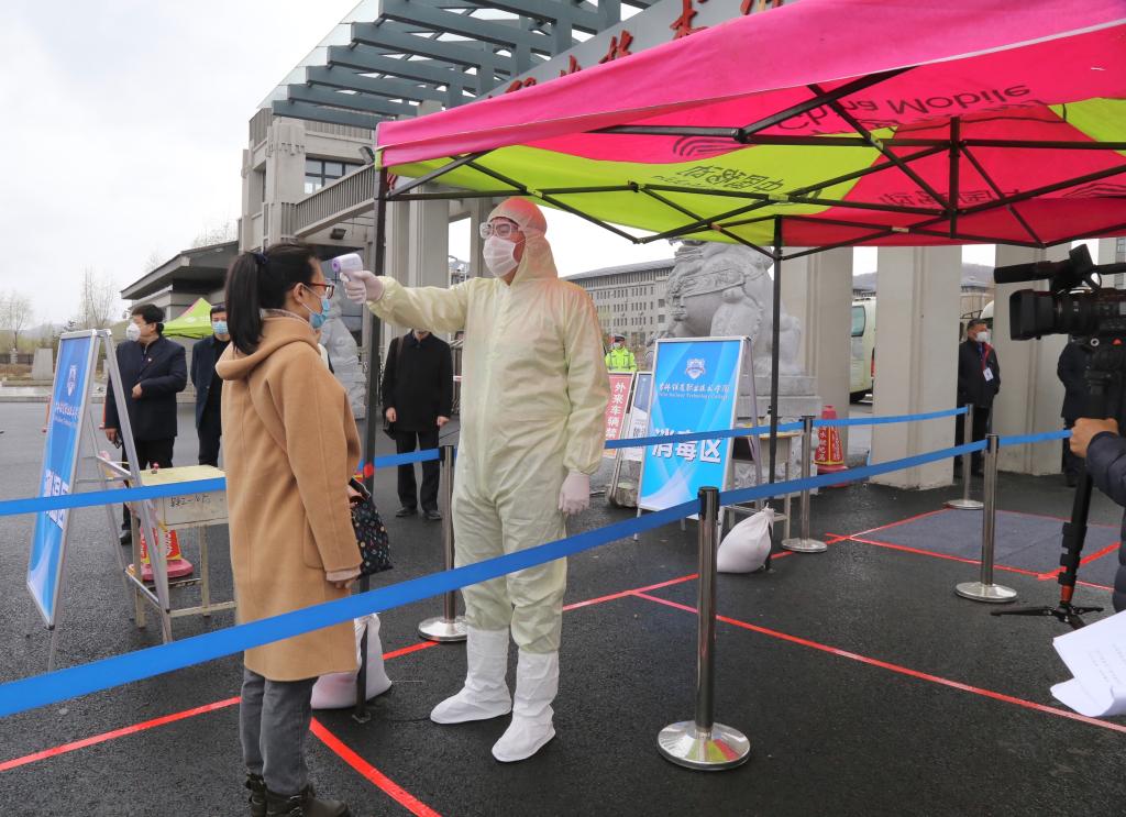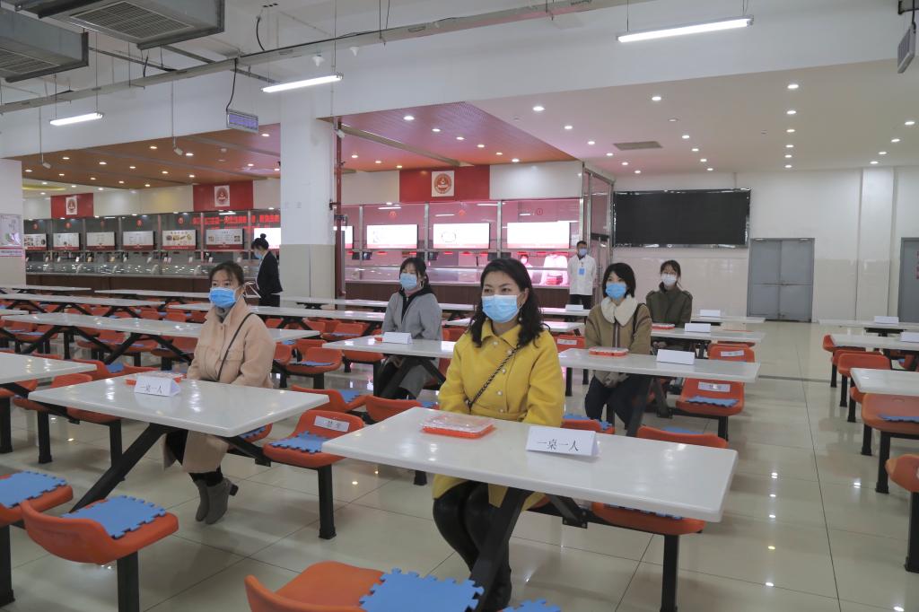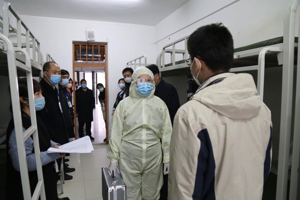 在吉林站东出口,校团委组织统一接站,在工作人员的带领下,返校“学生”间隔一米距离站队到达停车点,拿出手机APP展示前期返校审批结果和相关证件进行身份核验后,进行体温检测、手部消毒和口罩更换,随后有序登车,并在工作人员组织下进行乘车登记。在校门口处,返校“学生”依次经过测温区、消毒区、身份核验区。在公寓,“学生”对《健康登记表》进行签字确认,拿出手机扫码确认身份匹配,在经过测温门提示体温正常后进入。在食堂,“学生”经过测温门提示体温正常后进入,进行手部消毒,并保持一人一桌、同向就坐有序就餐。在教学楼,各教室桌椅摆放数量减半、拉开距离,并在每一个教室里都配备了体温计、消毒和通风记录本。在集中医学隔离观察区,“留观人员”、体温检测、送餐、保洁、消毒工作人员都需经过指定路线进入、离开。并按照规范进行个人防护,处理防护装备。