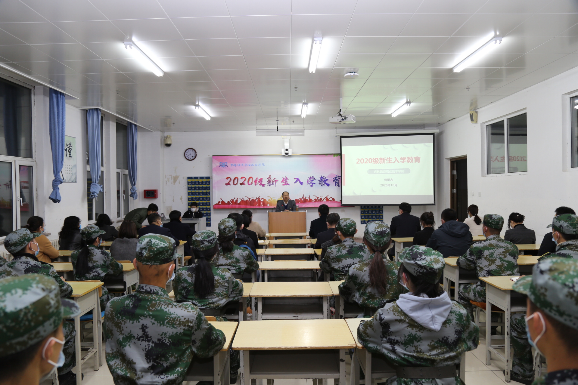 曹炳志以“选择”作为为本次入学教育的主题,内容丰富,意味深长,语言生动,引人入胜,依托学校先进的智慧教学管理平台,结合大量图片、视频为大家呈现了一场精彩绝伦、振奋人心的入学教育讲座。曹炳志提到:选择一座城市,就是选择人生载誉荣归的第二故乡。“吉祥天佑,林碧水秀”的吉林市将会成为大家人生铸就辉煌最难忘的地方。选择一所大学,就是选择人生幸福梦想的扬帆启航,“历史悠久,蓬勃发展”的吉铁院将会成为大家成长成才最坚强的后方。选择一种修养,就是选择人生内修外化的历练成长。“两职两高、德行高尚”的吉铁院特质学生,将会使大家在未来发展中发光发亮。他强调,突如其来的新冠肺炎疫情给人类社会带来了巨大冲击和挑战。这场突如其来的世界大考中,中国经受住了考验,交上了合格的答卷,中国人民也更加坚定了打赢这场疫情阻击战的信心。这种信心和底气来自我们对中国特色社会主义的四个自信。正是因为坚定“四个自信”使全中国人民凝聚起战胜疫情的强大力量。
