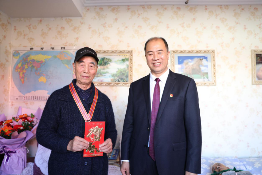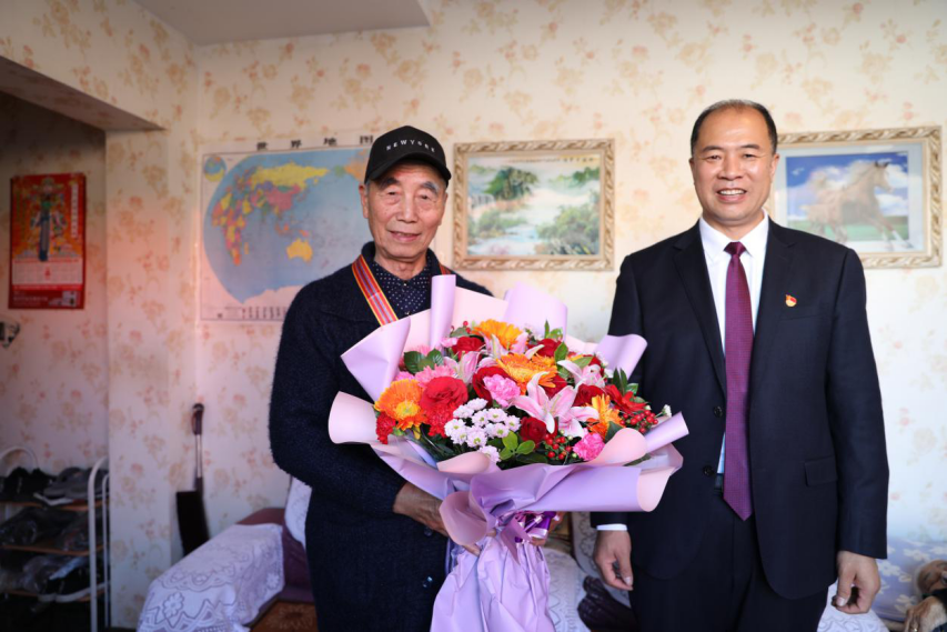 岳金城老人1950年12月参加抗美援朝,1953年抗美援朝战争胜利后回国。在纪念中国人民志愿军抗美援朝出国作战70周年之际,中共中央、国务院、中央军委向参加抗美援朝出国作战的、健在的志愿军老战士老同志颁发“中国人民志愿军抗美援朝出国作战70周年”纪念章。在走访慰问过程中,曹炳志校长为岳金城老人佩戴抗美援朝纪念章,送上了鲜花和果篮。岳金城老人感谢党和人民给予的荣誉。他向大家讲述了当年抗美援朝时艰辛而又难忘的经历,以及当时战斗生活的情景。曹炳志校长对志愿军老战士不怕牺牲、保家卫国、为国家和人民所作出的伟大贡献表示敬意。参加走访的同志听后也都深受感动和教育,深深感到在和平年代更要铭记这来之不易的伟大胜利。曹校长还关切询问了老人的身体健康情况和生活起居,表达了学校对他的关心和问候。