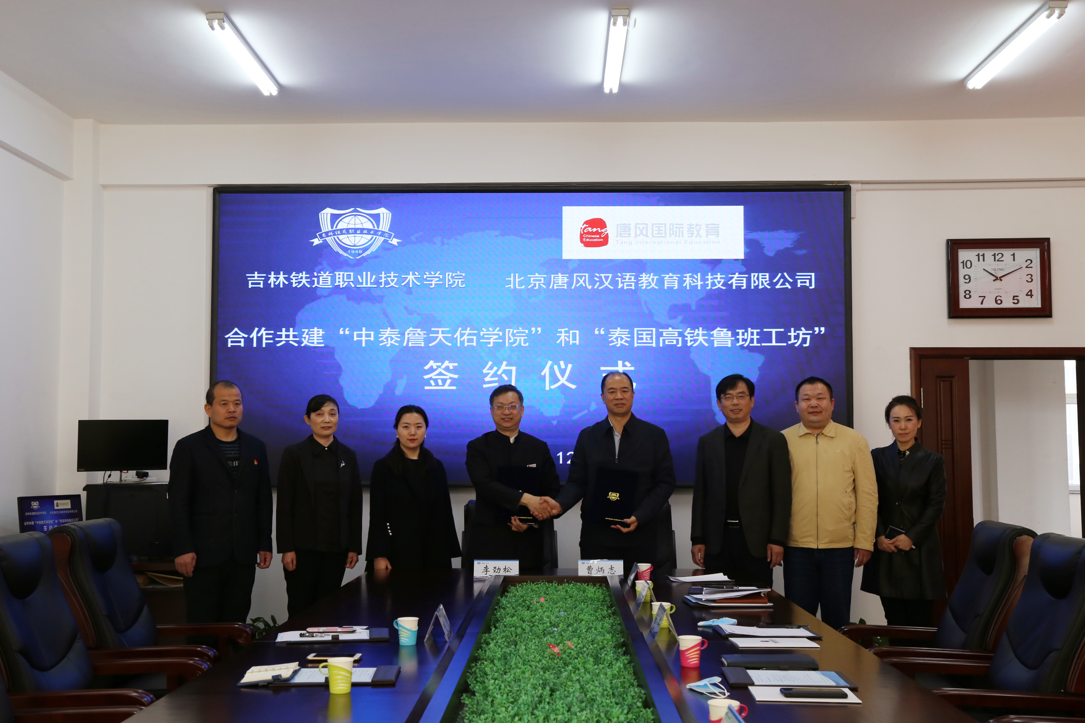 签约仪式上,曹炳志代表学校对北京唐风汉语教育科技有限公司李劲松总裁一行的到来表示热烈欢迎。他指出,共建“中泰詹天佑学院”和“泰国高铁鲁班工坊”是学校贯彻落实《中国教育现代化2035》《职教20条》及吉林省委、省政府关于建设“一带一路”向北开放重要窗口,积极服务高铁走出去战略,推进学校“双高计划”建设的具体举措,希望双方务实推进项目建设,输出吉铁院特色、经验,打造“詹天佑学院”和“高铁鲁班工坊”品牌,为未来向东北亚地区输出职业教育方案打基础、做准备。