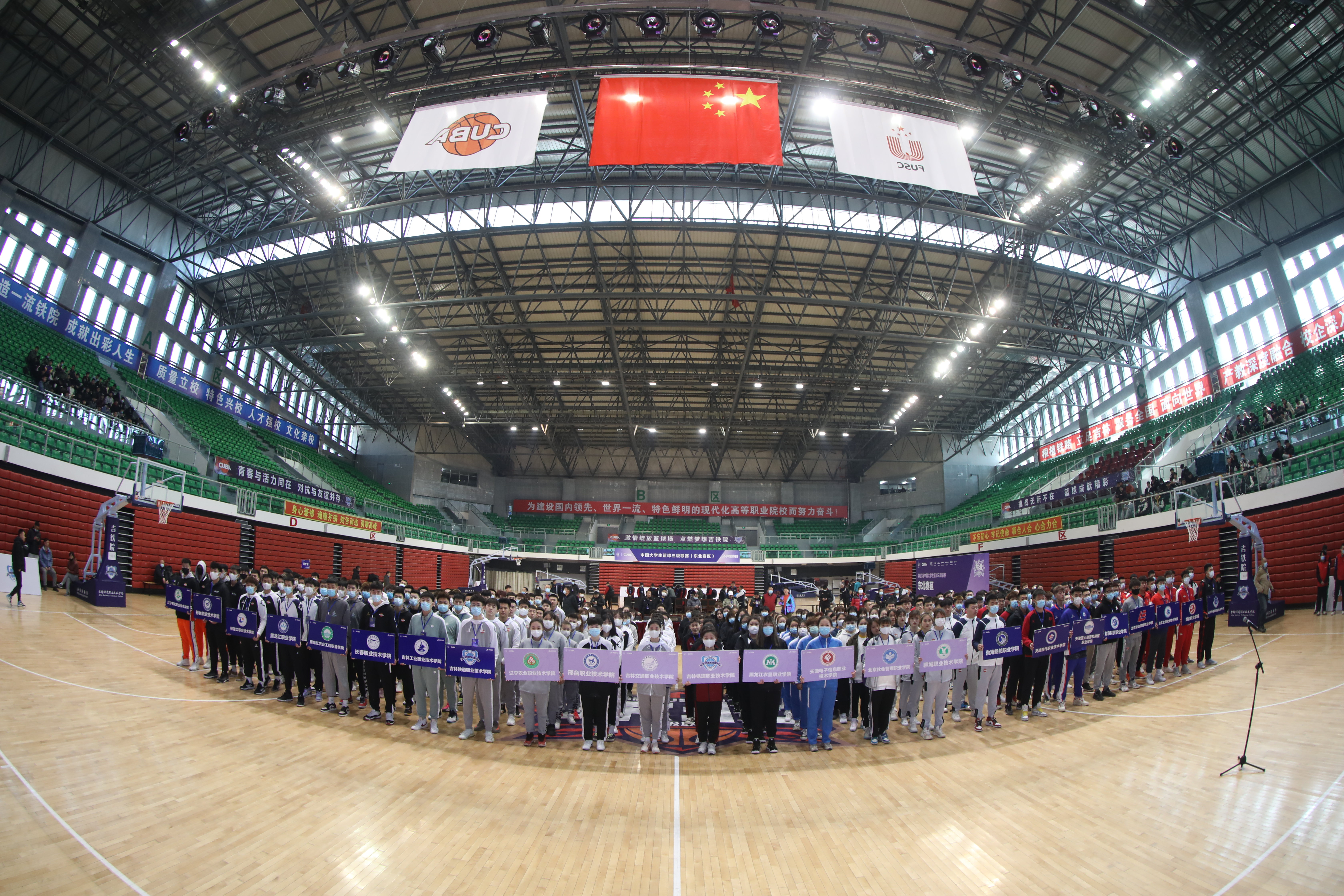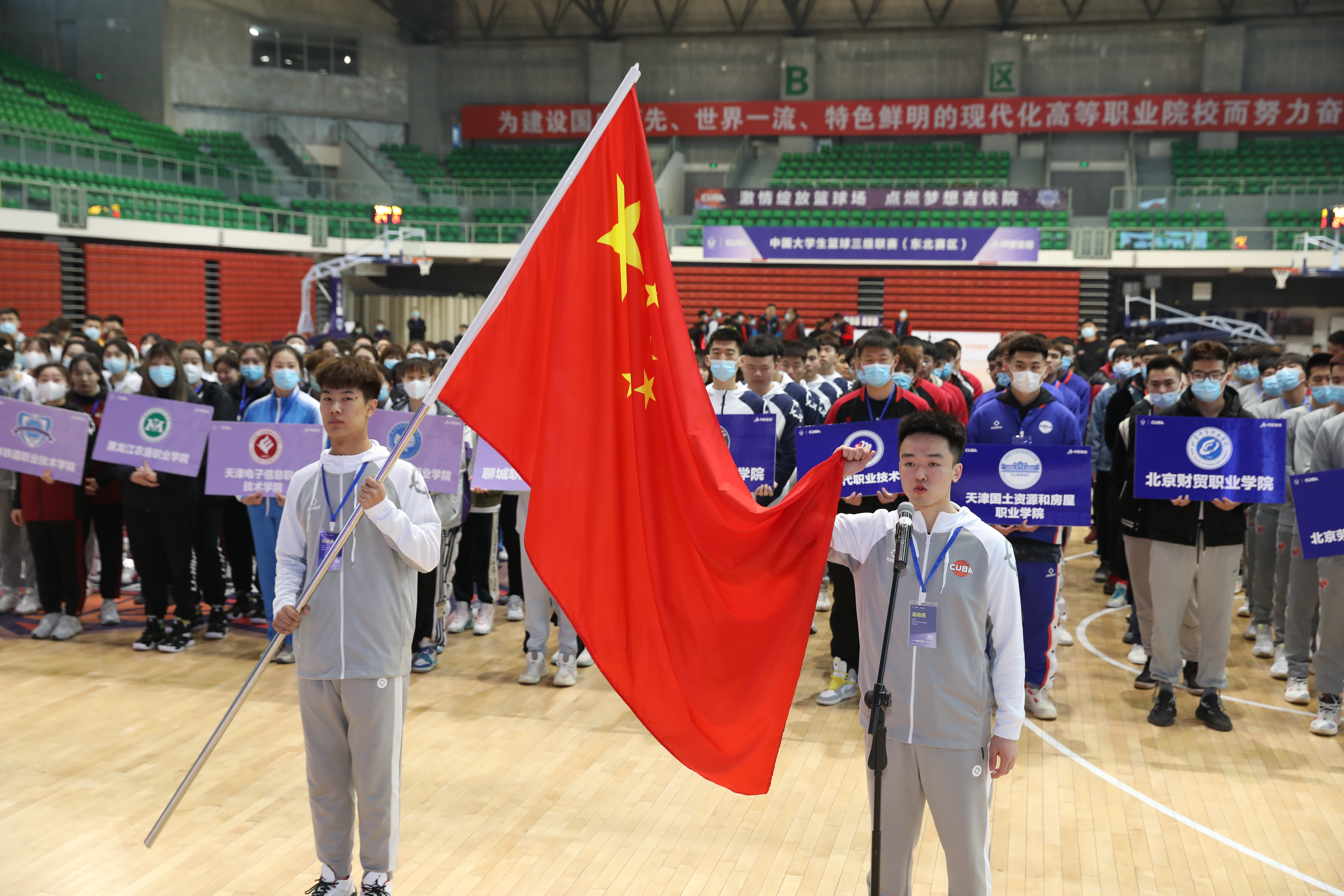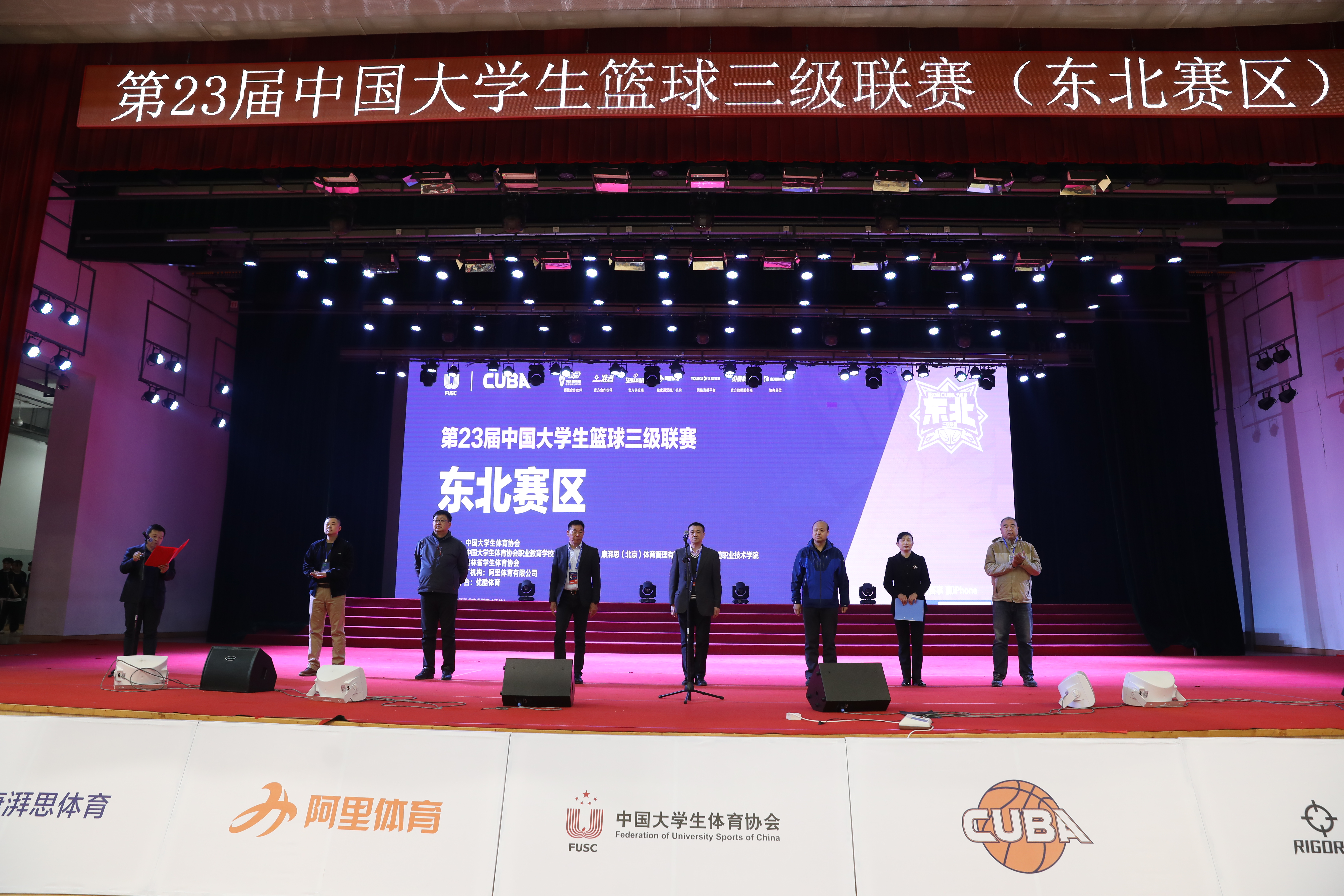 中国大学生体育协会职业教育学校体育工作委员会秘书长贾书申向比赛承办方和协办方致谢;中国大学生体育协会综合部主任张汉宣布比赛开赛;吉林省教育厅体育卫生与艺术教育处处长胡仁友为首场比赛跳球。