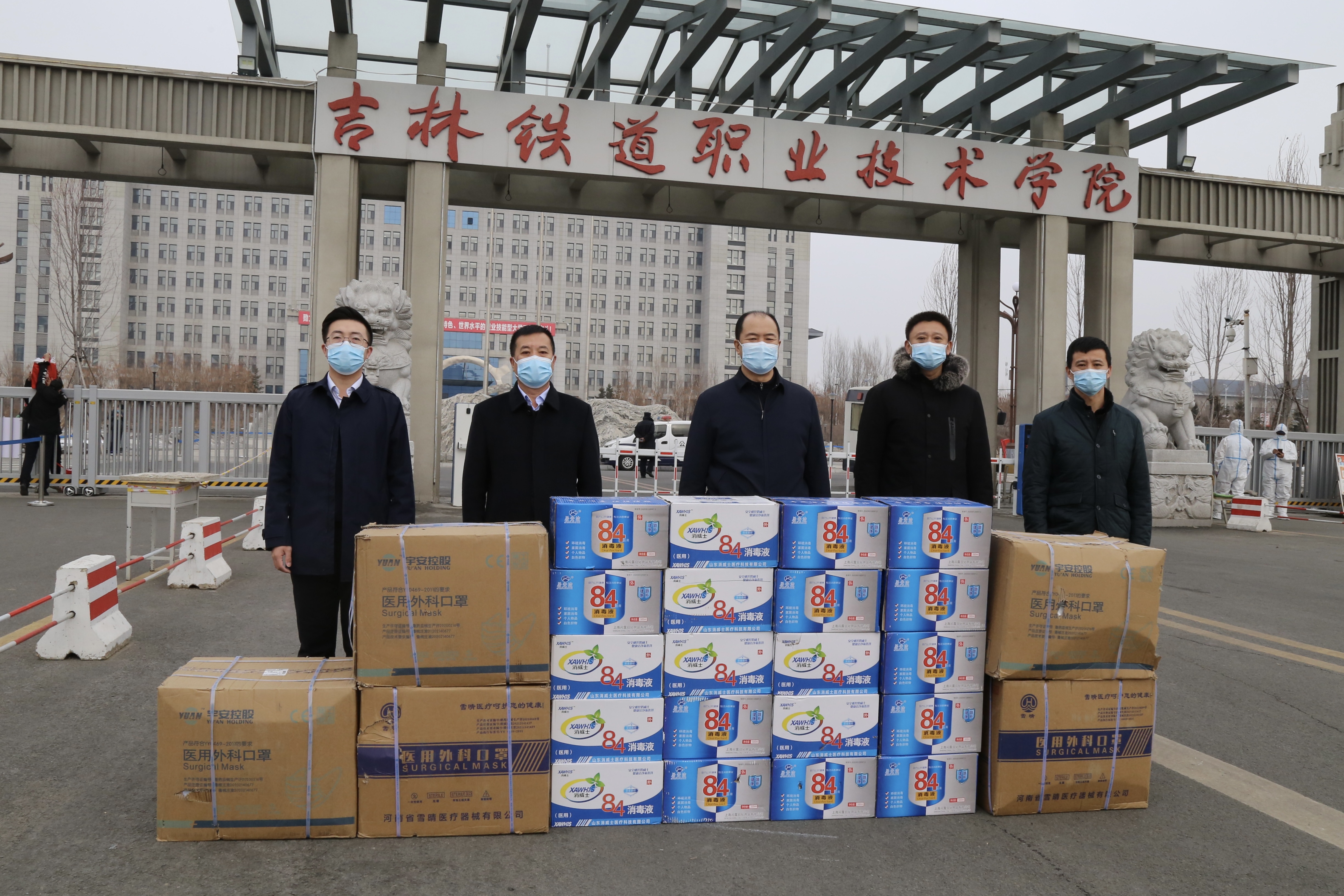 3月8日,九台农商银行行长李成满、财务部长李文超一行2人来到学校,向学校捐赠医用外科口罩20000只,消毒液600瓶。