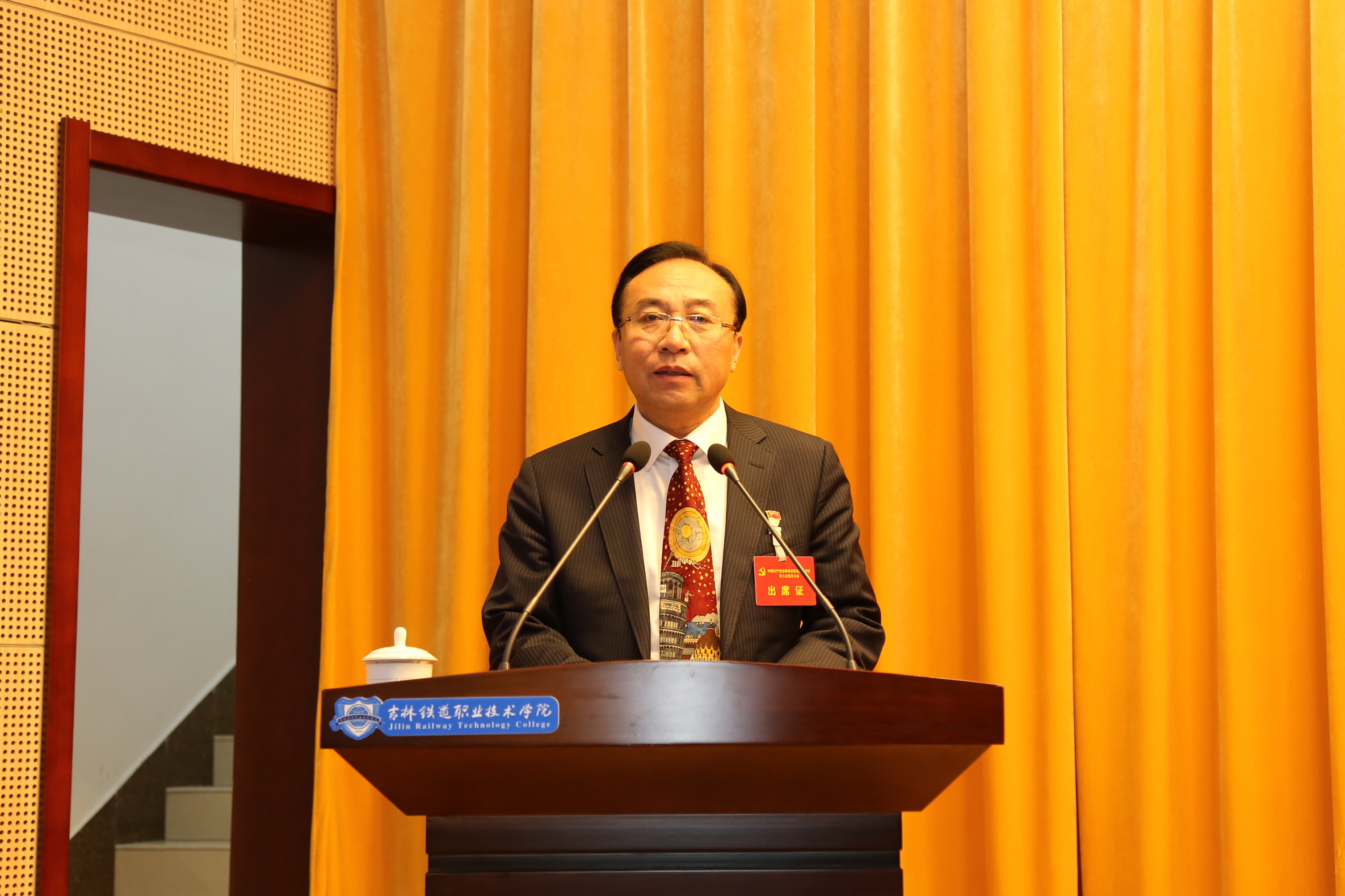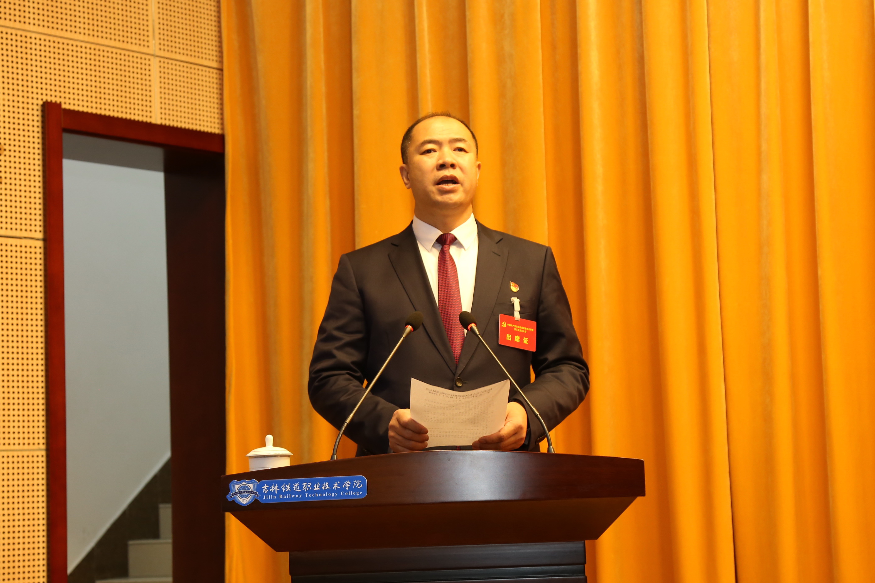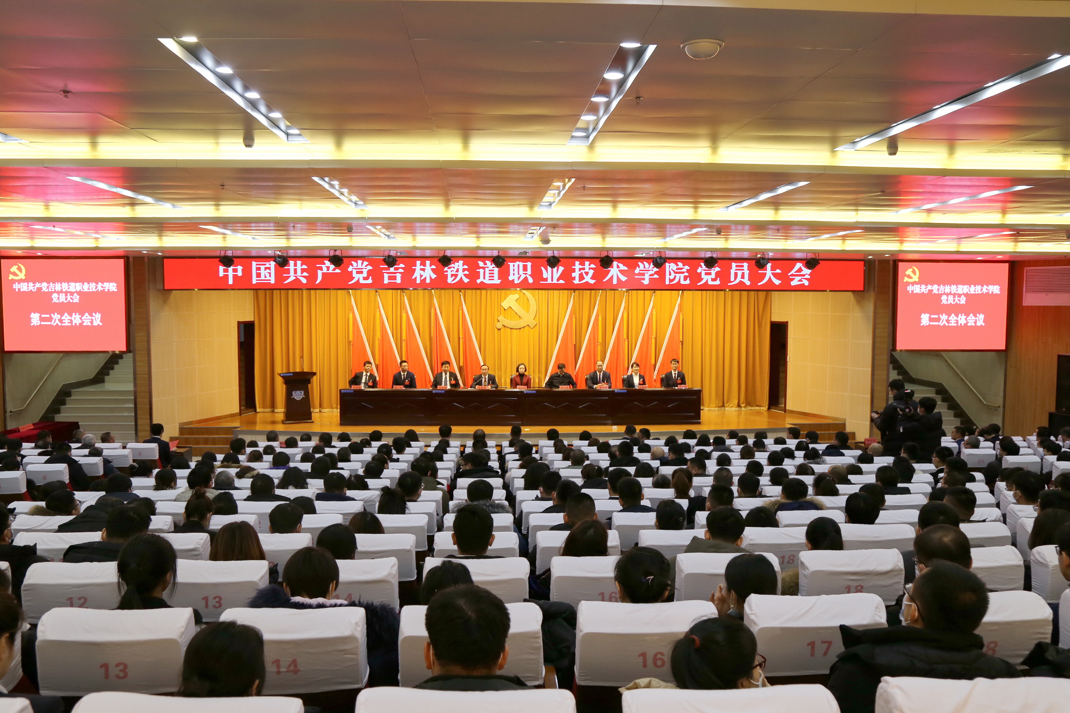 会场内气氛庄重而热烈。主席台上方“中国共产党吉林铁道职业技术学院党员大会”的会标格外醒目。后幕正中的金色党徽,在两侧10面红旗的映衬下熠熠生辉。374名党员,非党中层领导干部、非党高级知识分子和民主党派代表汇聚一堂、共襄学校发展改革壮举。省属高校党委集中换届工作第七指导组全体成员出席大会。