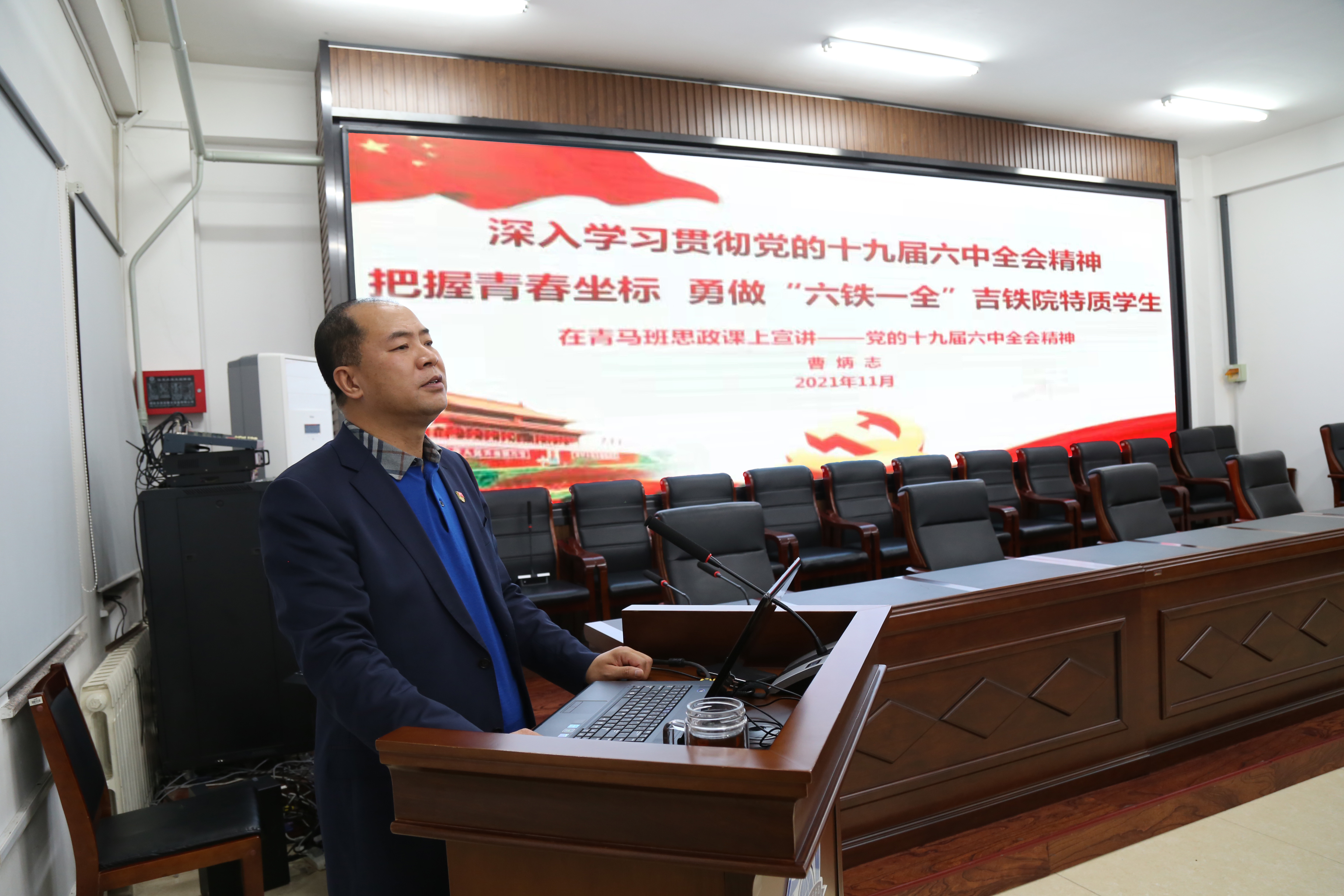 他以《深入学习贯彻党的十九届六中全会精神 把握青春坐标 勇做“六铁一全”吉铁院特质学生》为题,围绕“深刻认识《全会》重大意义和历史地位、深刻领会《全会》精神实质和核心要义、深刻理解习近平总书记对青年的殷切期望、深刻把握青春坐标,勇做“六铁一全”吉铁院特质学生”四个方面做了宣讲。
