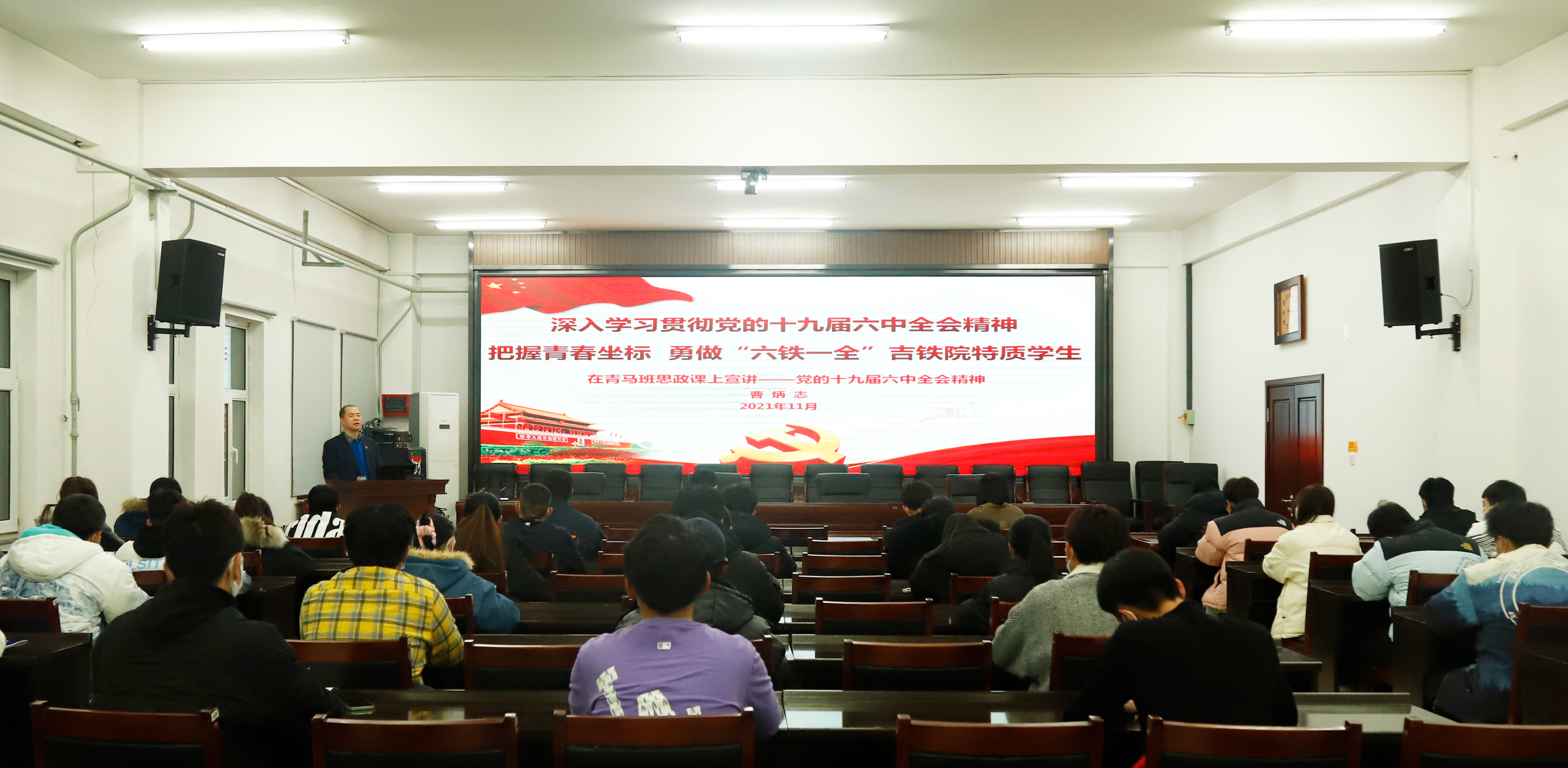在全校上下深入学习宣传贯彻党的十九届六中全会精神之际,11月30日晚自习期间,学校党委副书记、校长曹炳志到第十二期青马工程骨干班上了一堂专题思政课,宣讲党的十九届六中全会精神,学生工作部(处)部(处)长李原福,团委副书记孙旭、高铁综合技术学院辅导员马帅和41名学员代表参加了本次思政课学习。