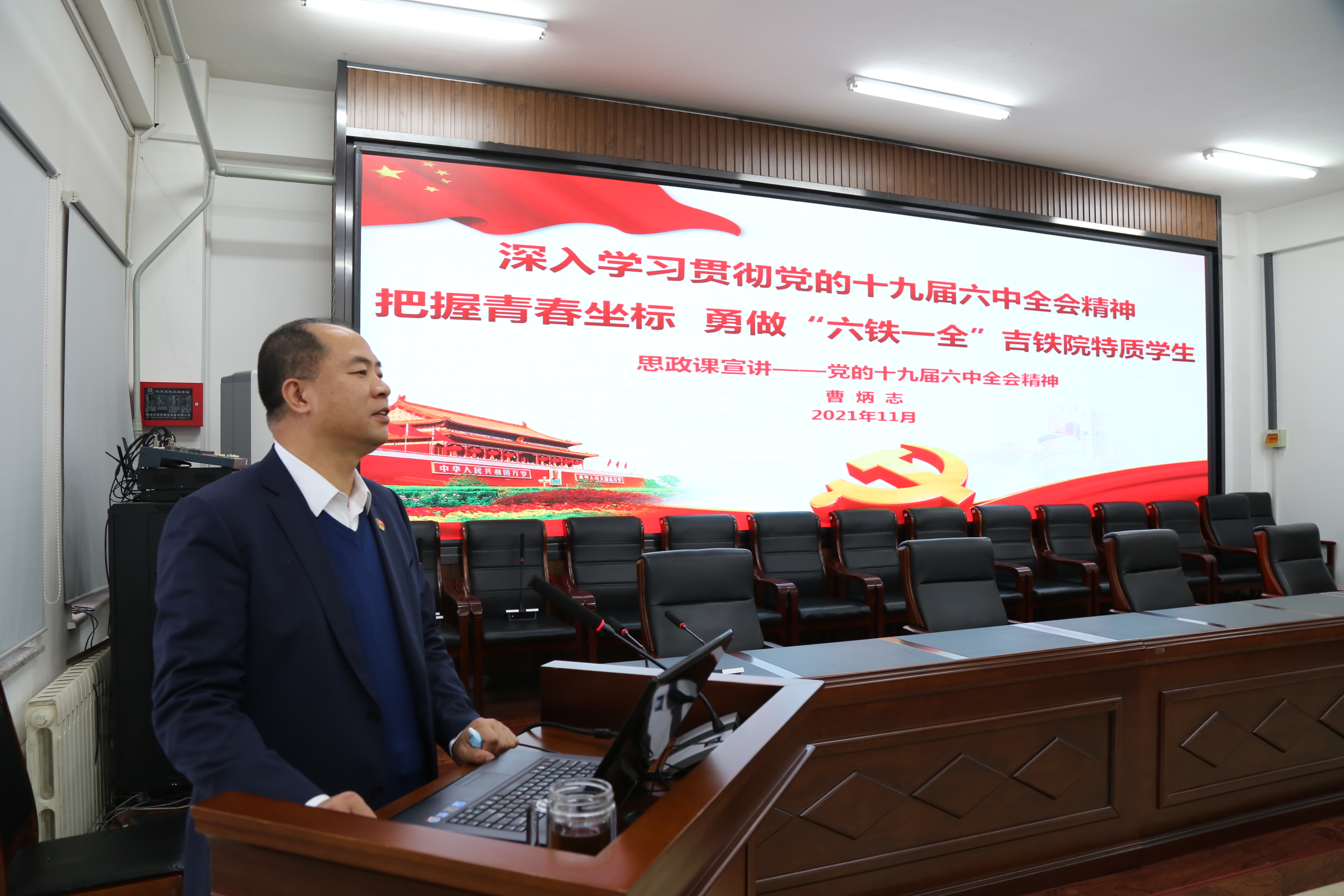 他以《深入学习贯彻党的十九届六中全会精神,把握青春坐标,勇做“六铁一全”吉铁院特质学生》为题,围绕“深刻认识全会重大意义和历史地位、深刻领会全会精神实质和核心要义、深刻理解习近平总书记对青年的殷切期望、深刻把握青春坐标,勇做“六铁一全”吉铁院特质学生”四个方面做了宣讲。