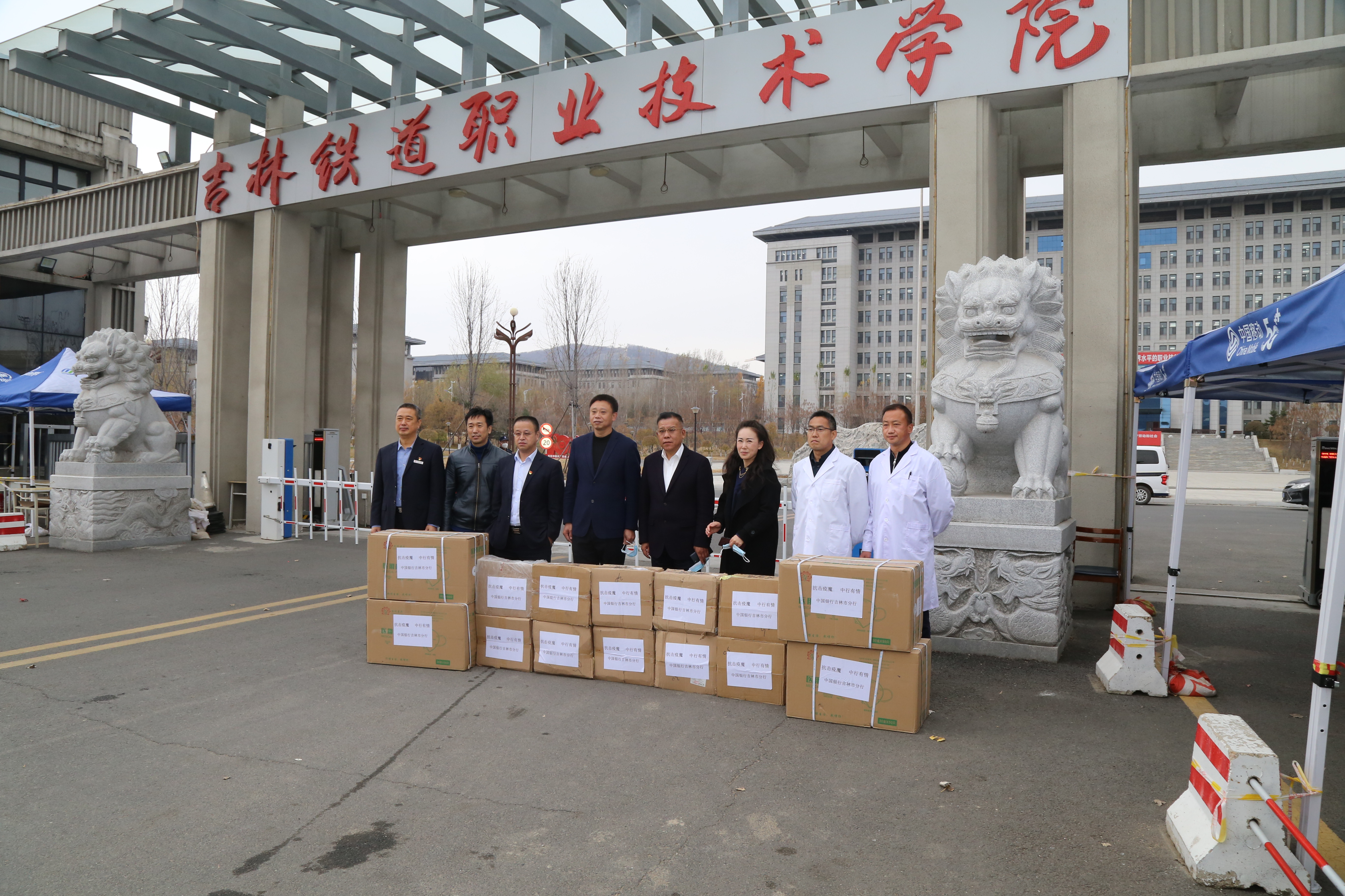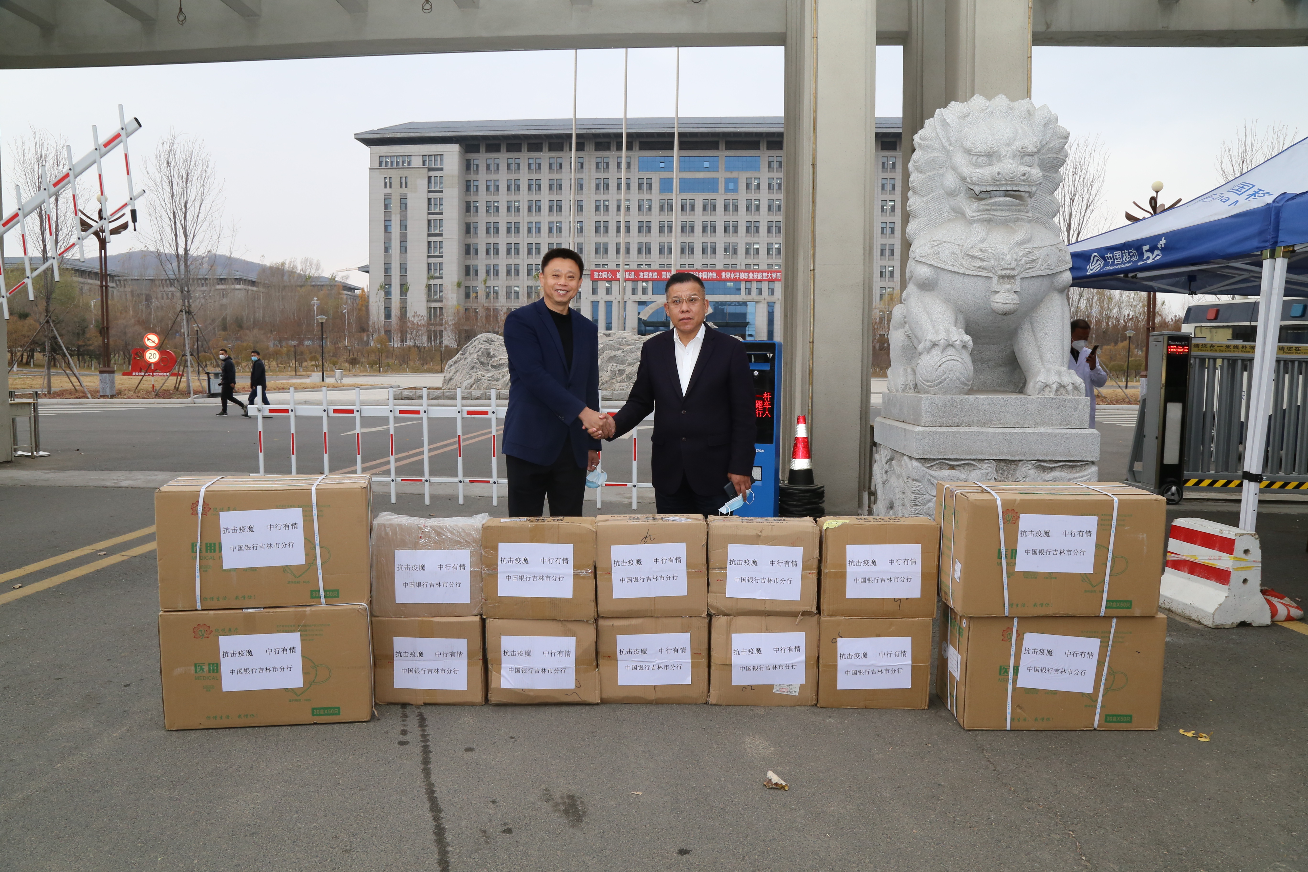 10月26日,中国银行吉林市分行行长徐锡刚、公司部韩奎民主任,中兴街支行行长张力带队向学校捐赠6000只N95口罩、10箱医用酒精等防疫物资。