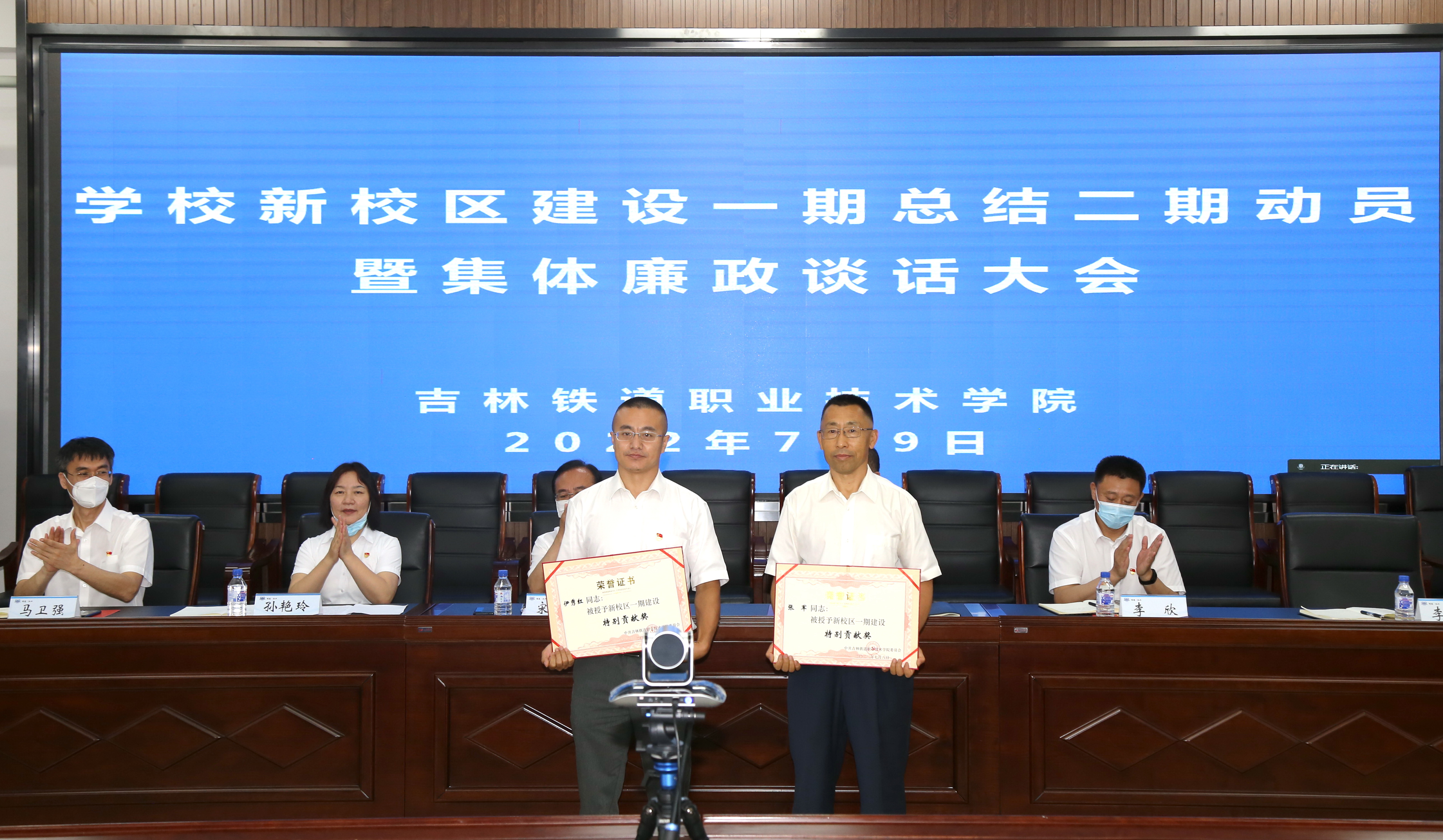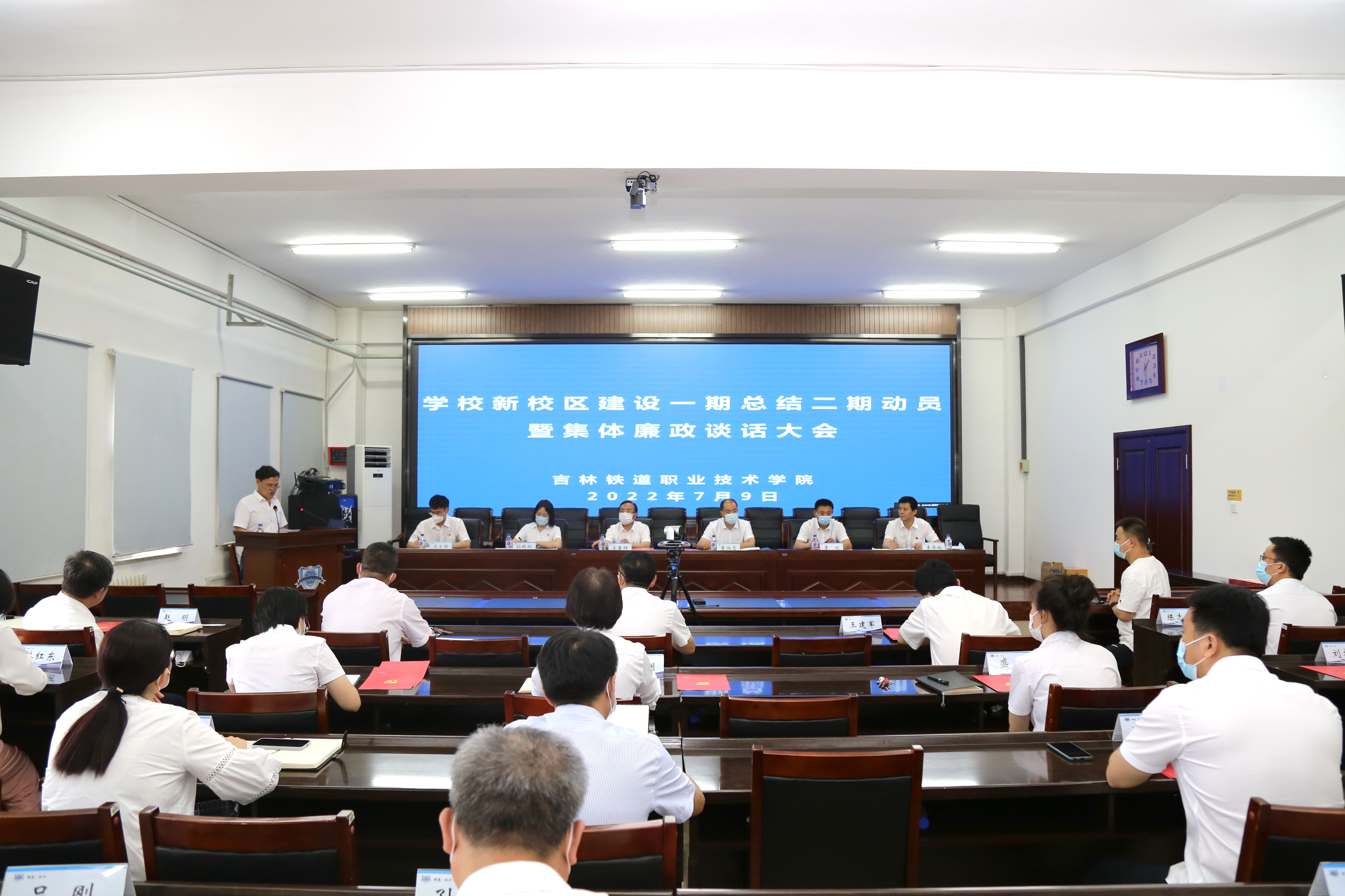 7月9日,学校在办公楼三楼会议室召开新校区建设一期总结二期动员暨廉政建设集体谈话大会,学校党委书记宋春辉,校长曹炳志,纪委书记、监察专员孙艳玲,副校长李欣,副校长马卫强,副校长李原福,校区二期指挥部全体工作人员,全校副科级以上干部和校区一期参建人员代表参加会议。会议由李原福主持。