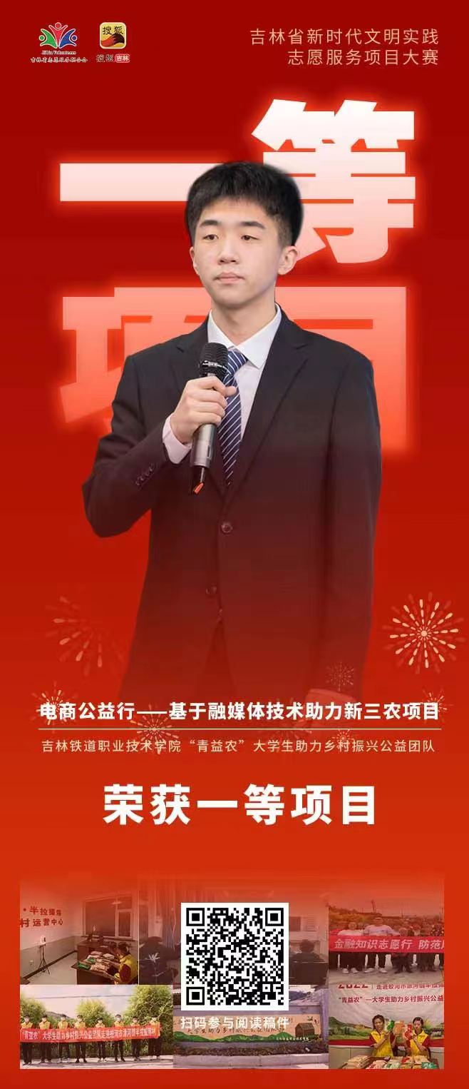 电商公益行——基于融媒体技术助力新三农项目结合农村发展现状,以新媒体产品为抓手,以融合思路做策划,以“工匠精神”打磨精品,以培养电商人才支撑为依托,实现了新媒体产品的重点突破和“多点开花”,逐步走出一条“融媒+三农”的融合发展新路。立足志愿服务活动,助力乡村振兴,项目团队参加各类比赛荣获吉林省金奖一项、银奖五项、铜奖三项。