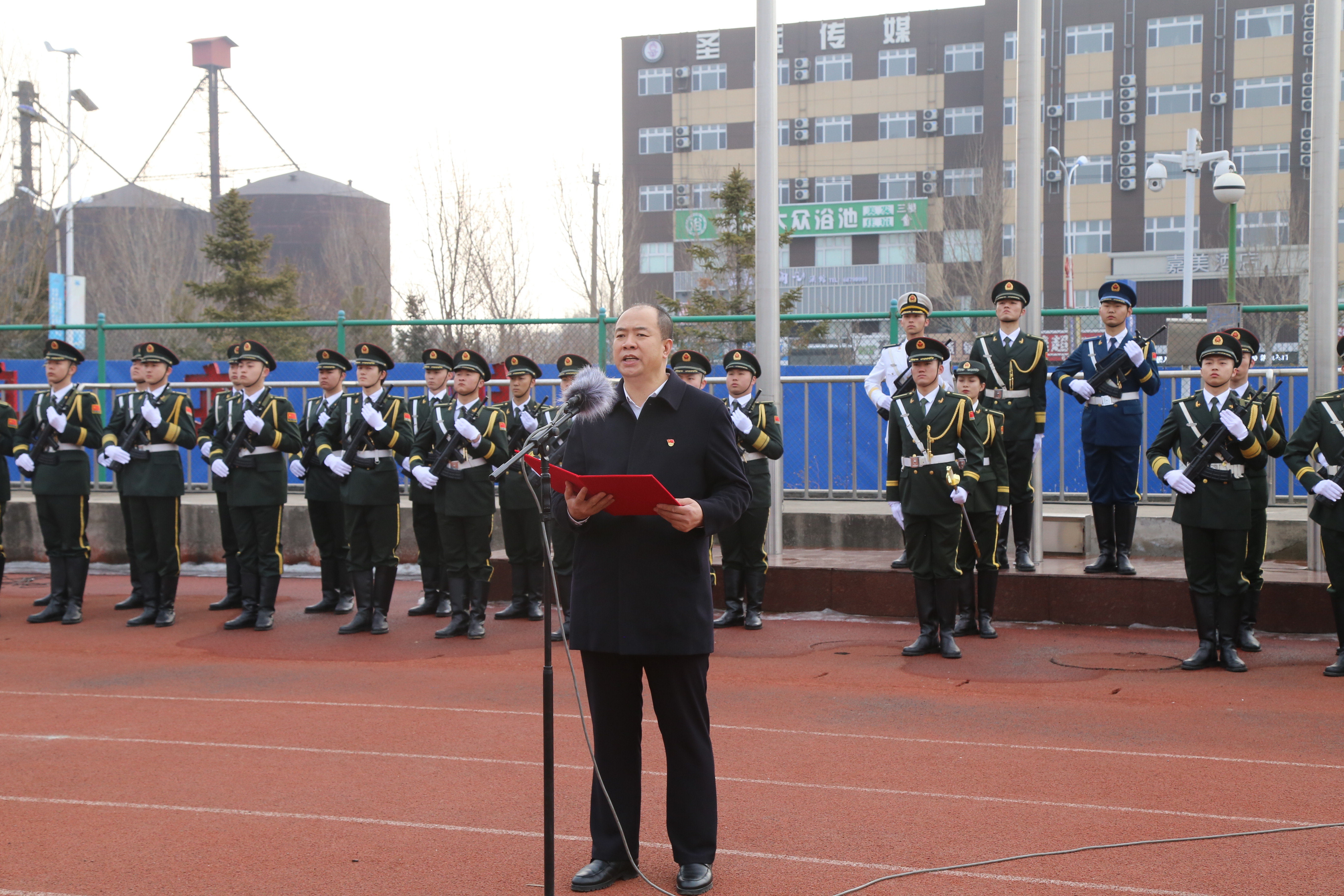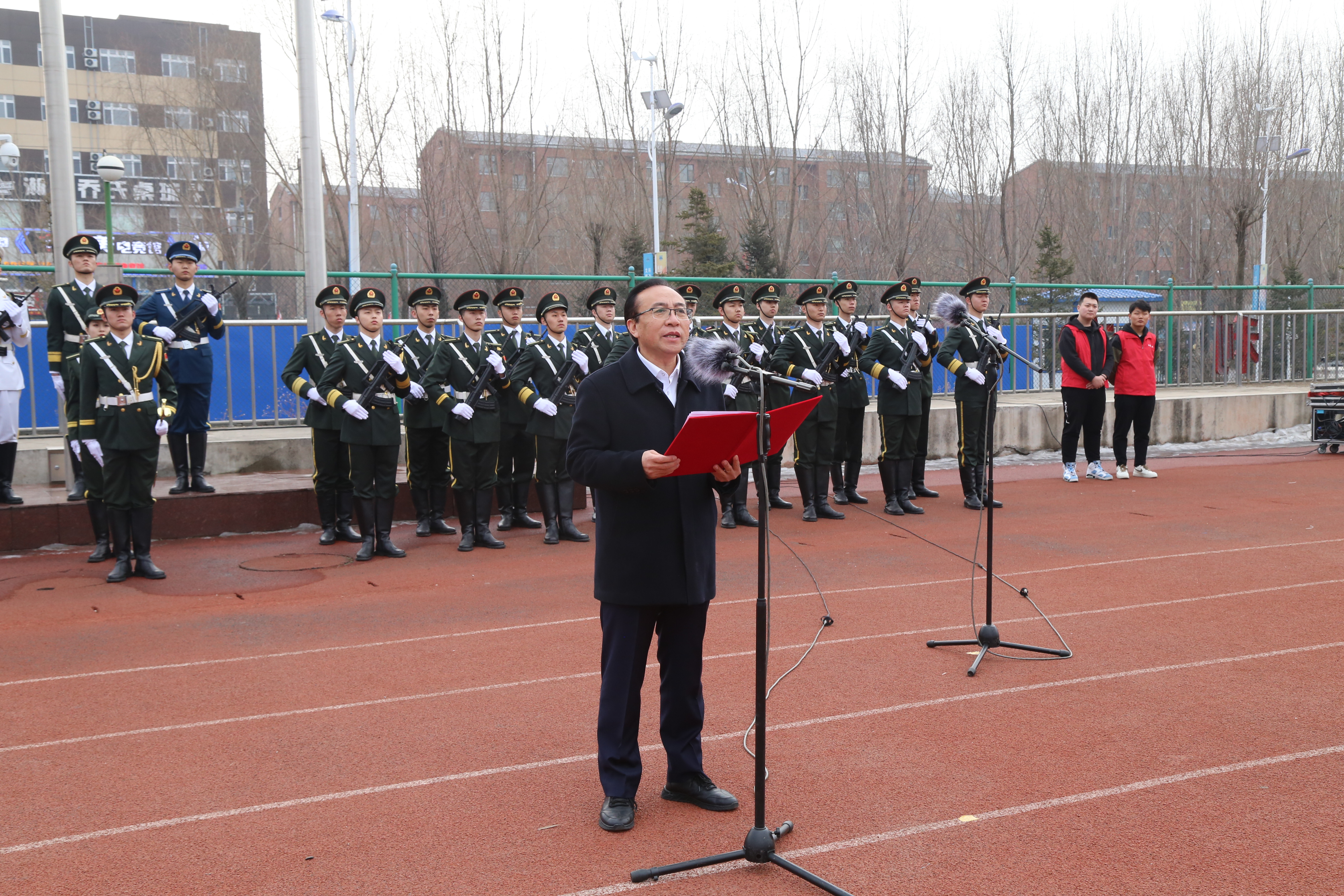 上午8时,伴随着激昂的乐曲,国旗护卫队队员昂首挺胸,迈着铿锵有力的步伐,护卫五星红旗入场。随着激动人心的《义勇军进行曲》响起,全体师生面向国旗,脱帽肃立,齐唱国歌,鲜艳的五星红旗冉冉升起。