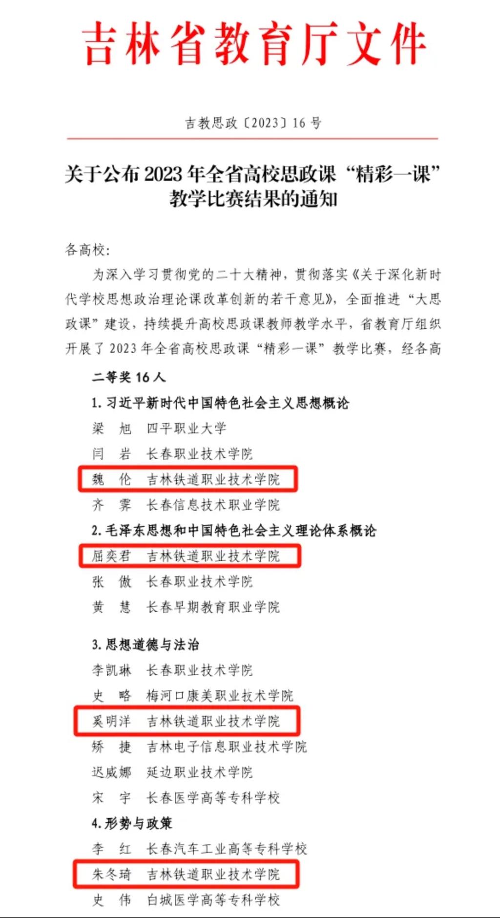 为深入学习贯彻党的二十大精神,贯彻落实中共中央办公厅、国务院办公厅《关于深化新时代学校思想政治理论课改革创新的若干意见》,全面推进大思政课建设,持续提升高校思政课教师教学水平,充分展示高校思政课改革创新成果,吉林省教育厅举办2023年吉林省高校思政课“精彩一课”教学比赛。在本次比赛中,由我校马克思主义学院4名教师组成的吉林铁道职业技术学院参赛队伍斩获佳绩,共获二等奖2项、三等奖2项。